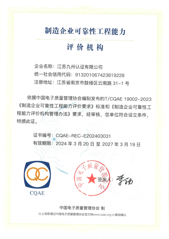 • 制造企業(yè)可靠性工程能力評(píng)價(jià)機(jī)構(gòu)證書(shū)